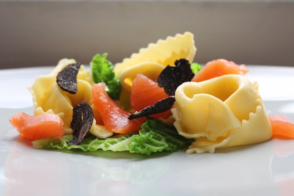 C’est une assiette joyeuse qui se croque sans retenue. On jongle entre les cappelletti, la truffe, le chou et le saumon. C’est un va-et-vient gourmand. Les graines de fenouil apportent fraîcheur et vivacité à la farce.
