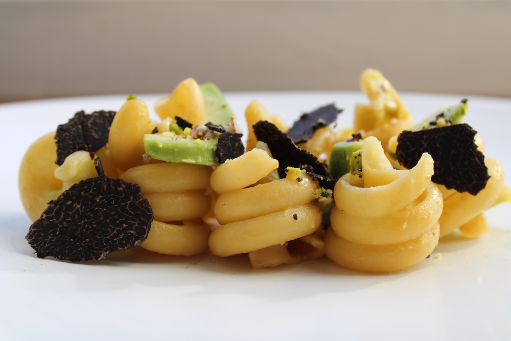 Cuire les trottole dans un grand volume d’eau salée et bouillante. Les égoutter. Les arroser immédiatement d’une demie tasse de café chaud. Mélanger. Incorporer les morceaux d’avocat et les lamelles de truffes. Mélanger.