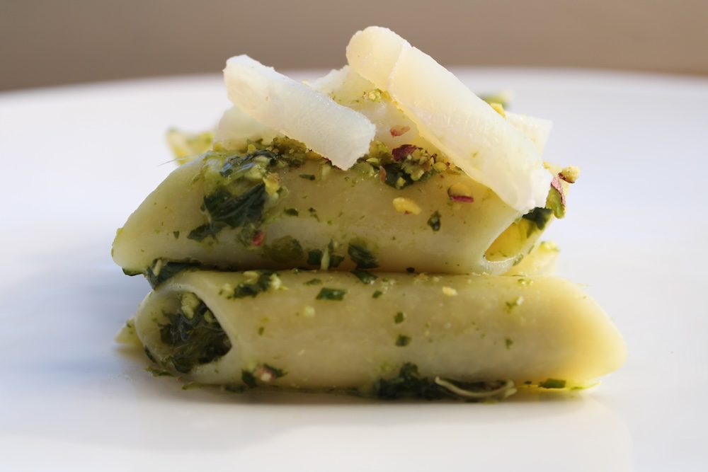 Penne, cabillaud, mâche, gingembre & pistaches