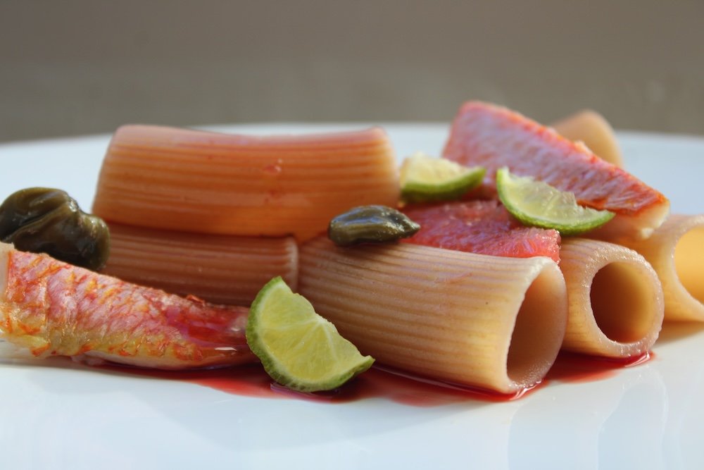 Rigatoni, rougets, orange, hibiscus, campari & citron vert