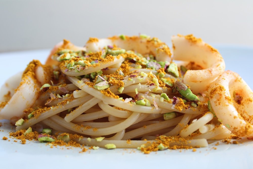 Cuire les bigoli dans un grand volume d’eau salée et bouillante, les égoutter al dente avant de les incorporer aux calamars. Arroser avec le jus de citron vert. Mélanger.