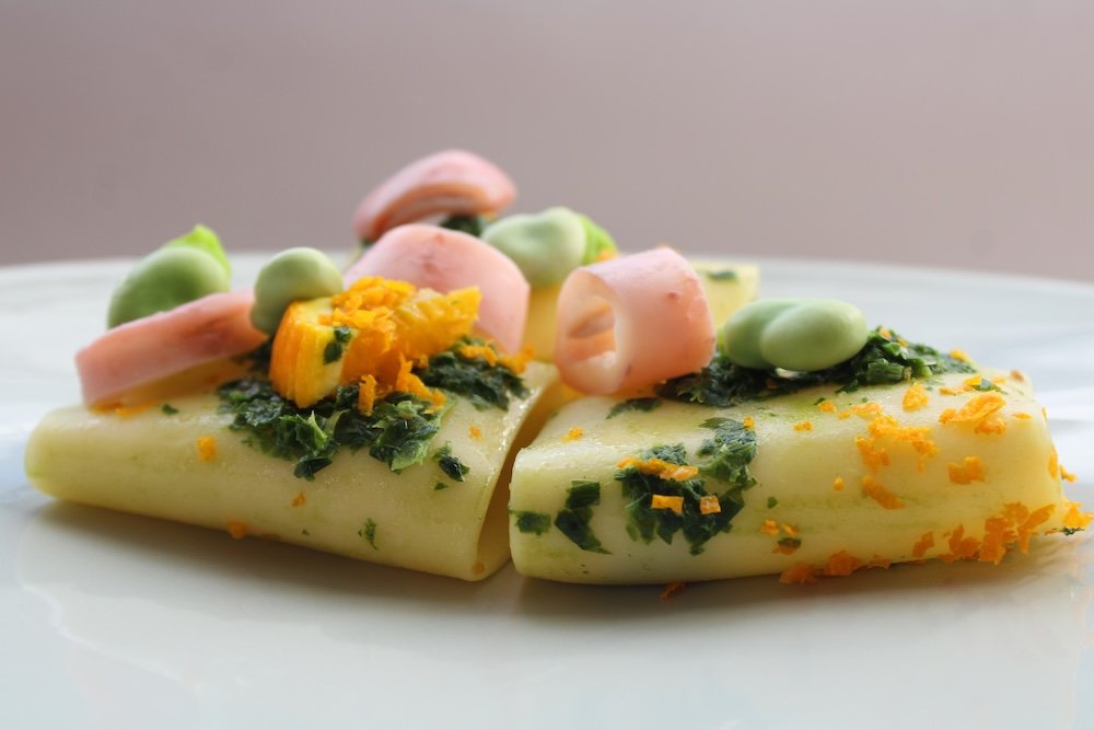 Paccheri, calamars, ail des ours, fèves & orange