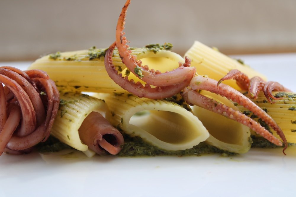 Pennoni, calamars, pesto verde