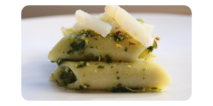 #433 – Penne, cabillaud, mâche, gingembre & pistaches